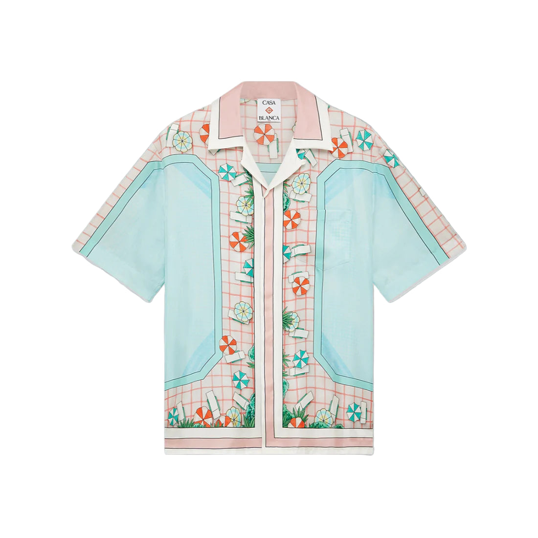 Add a splash of luxury resort-vibe to your wardrobe with the Casablanca Cuban Collar Short Sleeve Shirt in Copacabana Pink. A standout piece from the label’s “Copacabana” motif collection, this shirt blends silk-twill craftsmanship with a Cuban collar silhouette and signature graphic print inspired by pool-side travel idealism. Features like interlocking CC logo corozo buttons and printed silk fabric reinforce its elevated status.