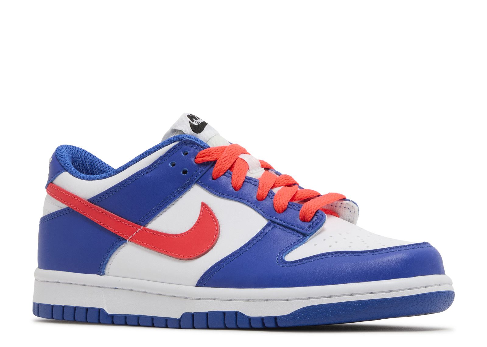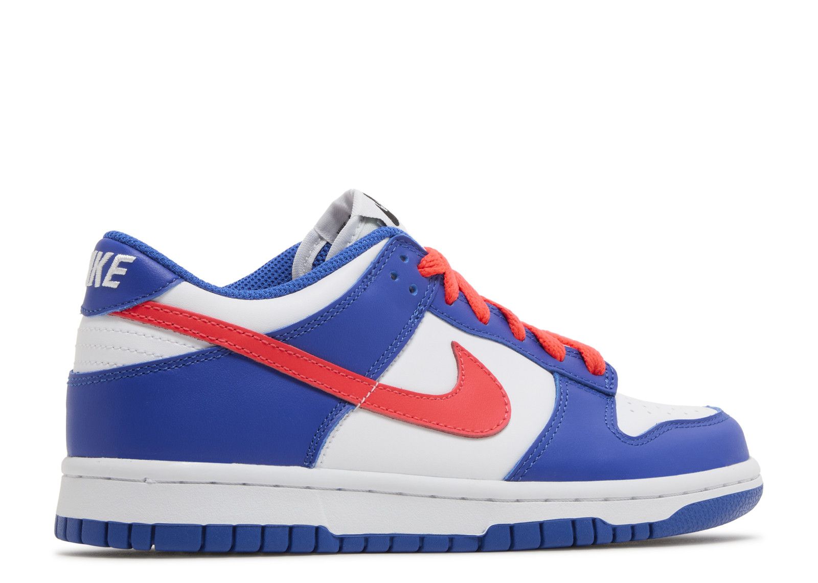 The Dunk Low 'Bright Crimson Game Royal' (GS) features a white base with royal blue panels and bright crimson accents on the laces and swoosh. Black branding appears on the tongue, sock-liner, and medial logos, while the white midsole and "NIKE" heel branding complete the design. The perforated white toe box and blue outsole finish the look.