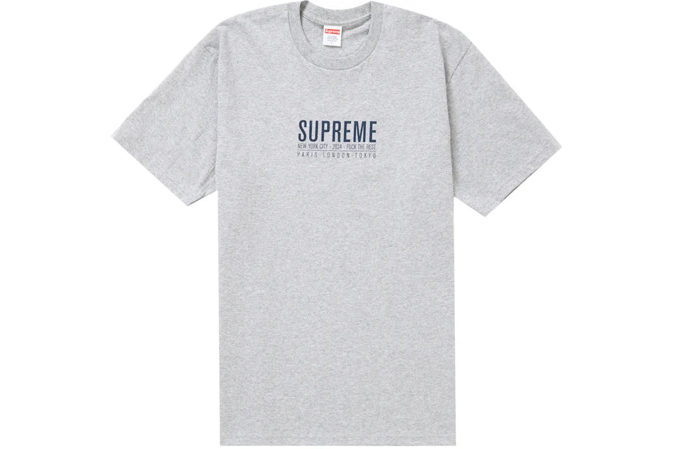 The Supreme Paris Tee in 'Heather Grey' keeps it clean and minimal with subtle nods to the brand’s global presence. Cut from soft cotton, the tee comes in a heather grey base with bold Paris lettering across the chest, blending everyday wearability with street-level statement.