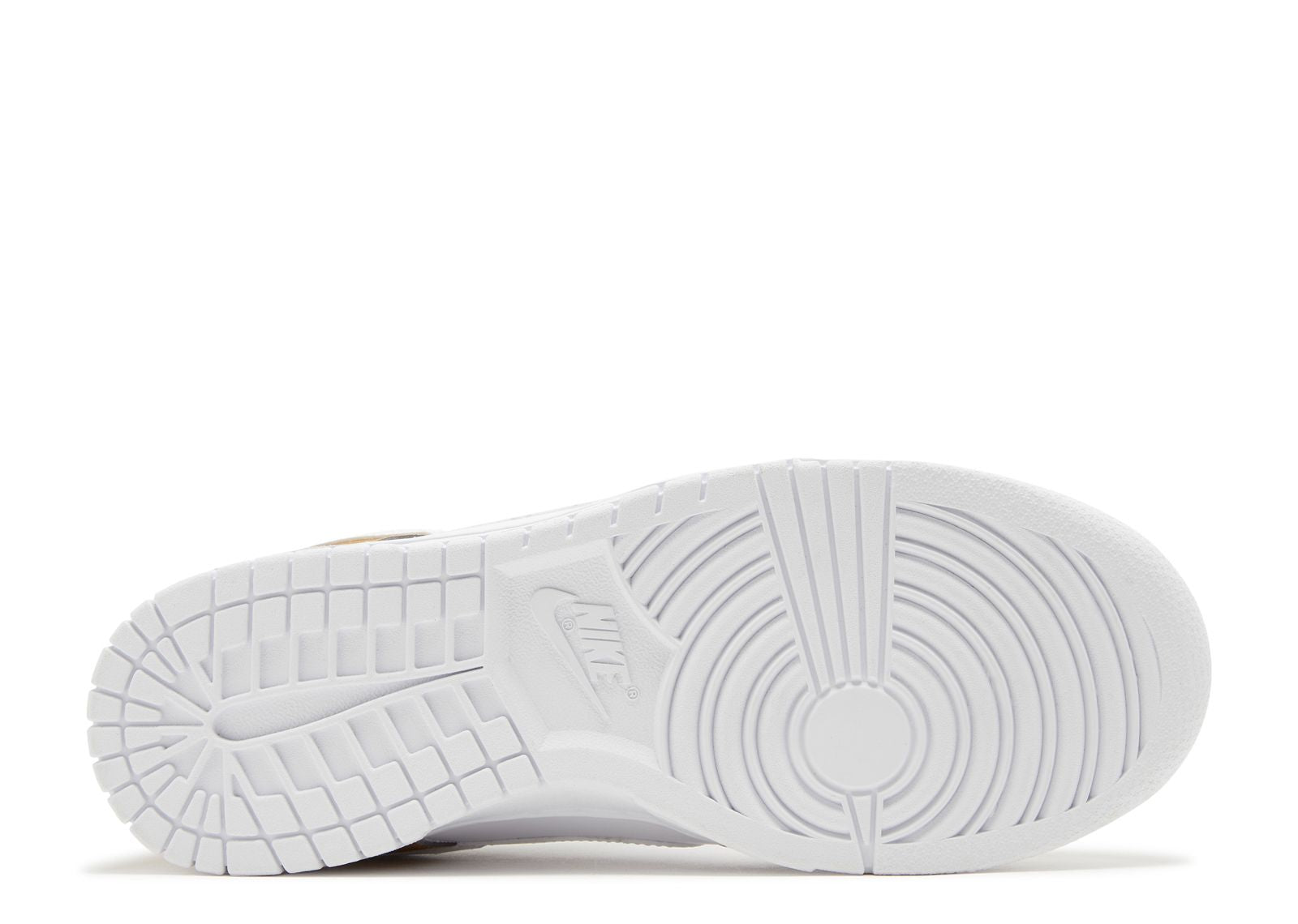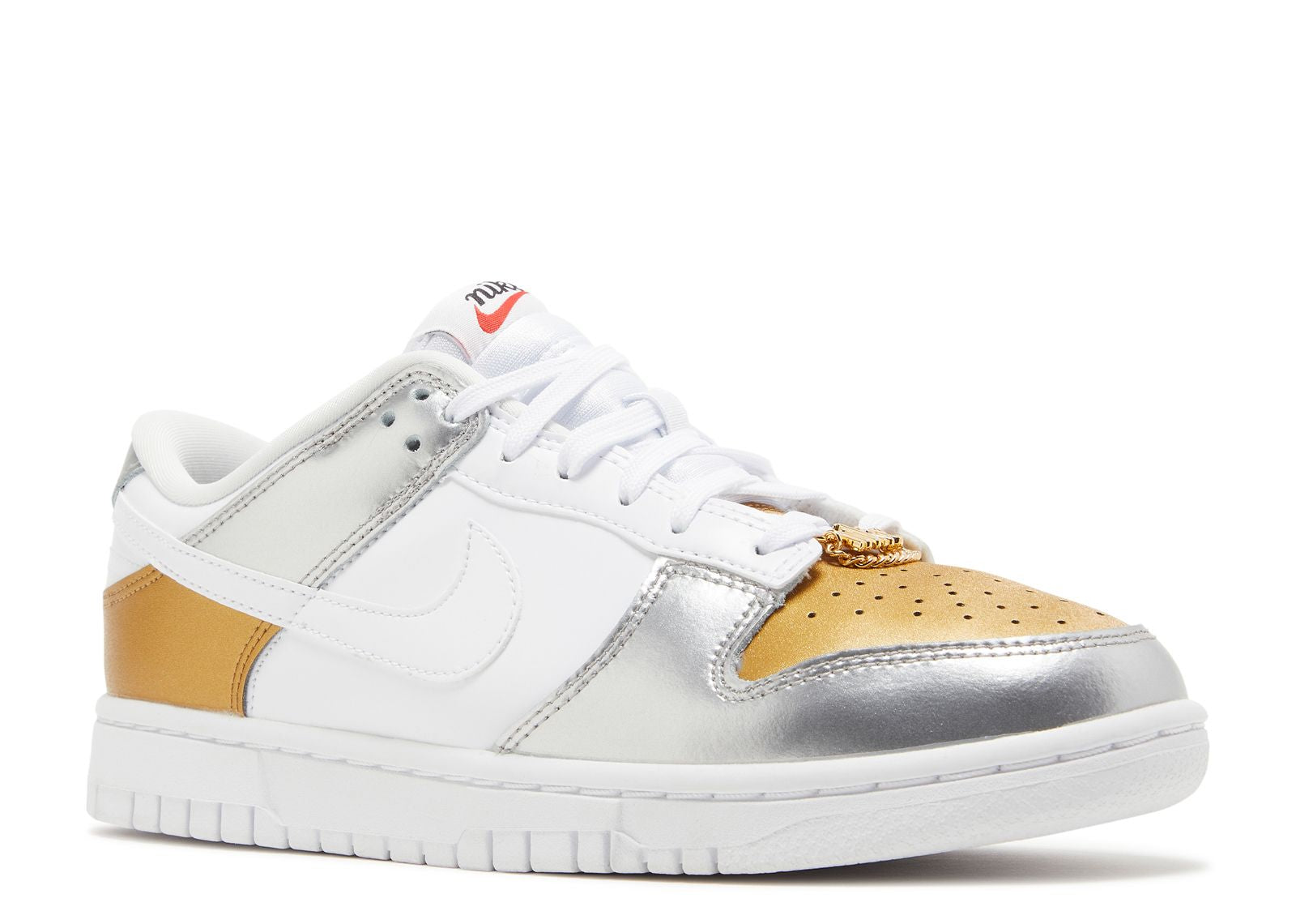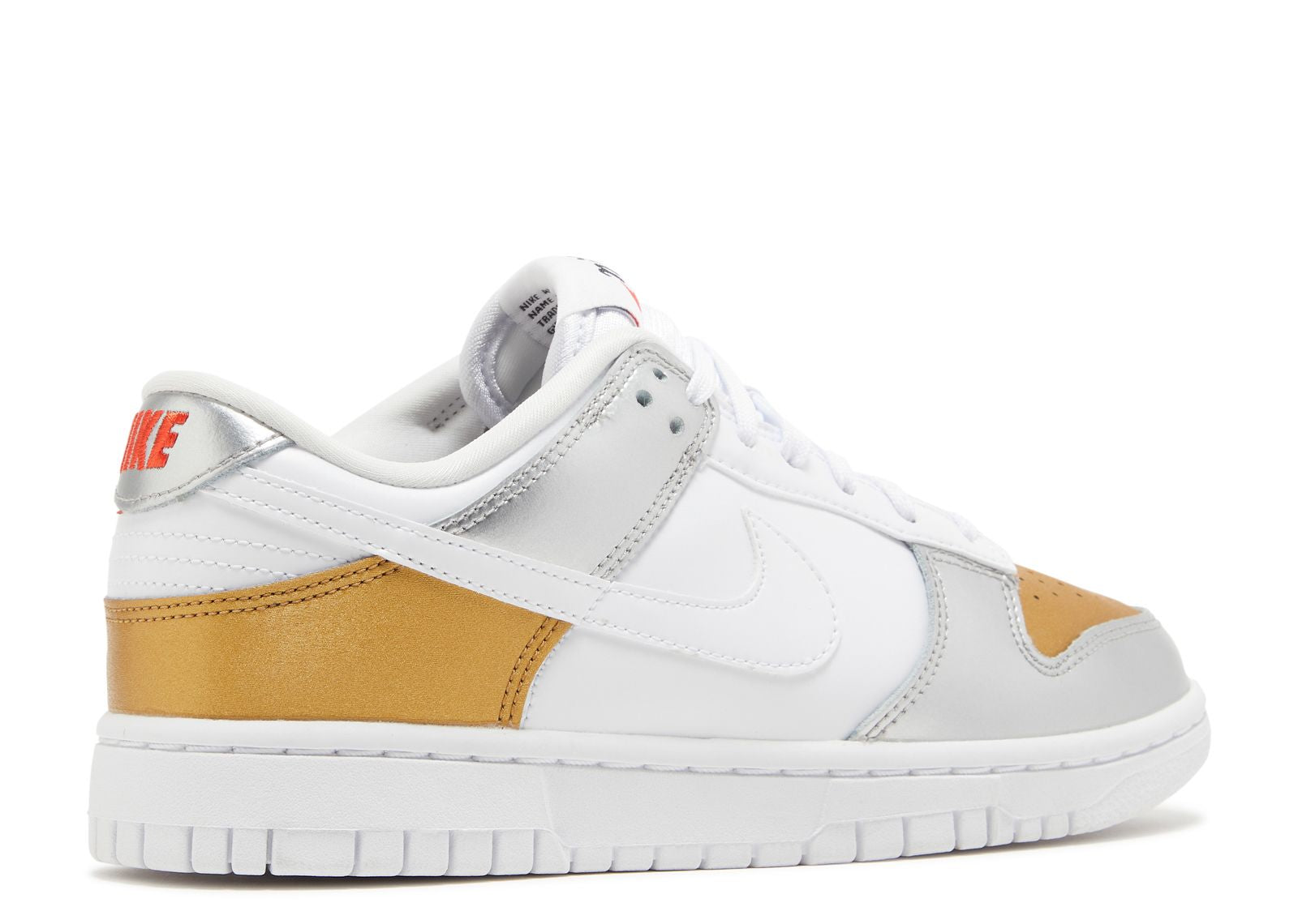The Dunk Low 'Heirloom' (WMNS) features a smooth white leather upper with a white leather swoosh. Metallic gold accents the toe box and heel overlay, while silver overlays appear on the toe cap, collar, and heel tab. An orange swoosh on the tongue and black-and-white leopard insole add contrast, with gold nike jewelery on the laces. The white midsole and outsole complete the look.